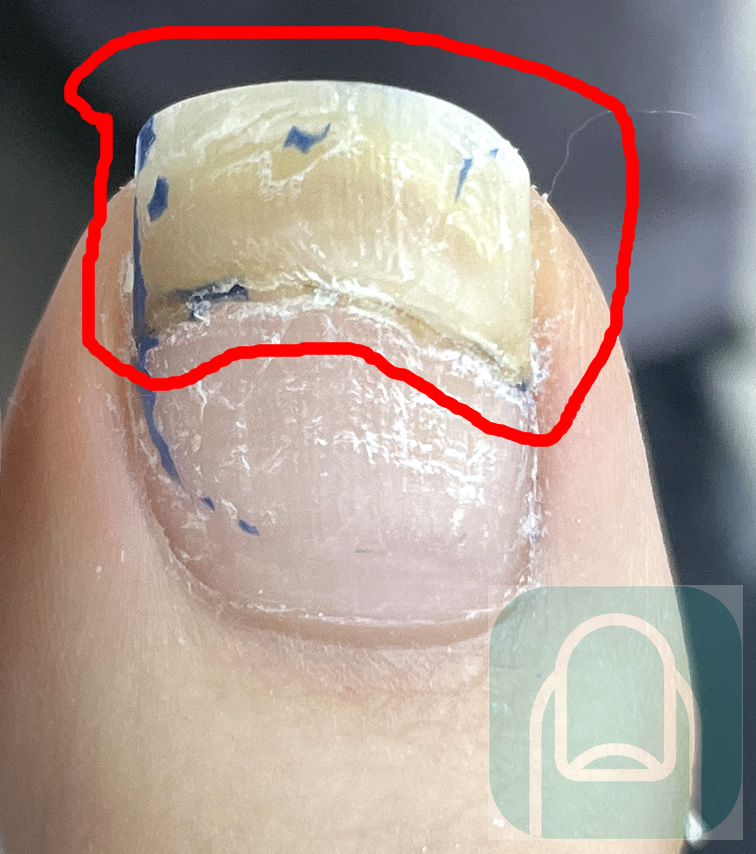 これは、このエリアが、爪の土台のお肉から離れてしまっているため、根本の方の爪色とは異なっている状態です。
